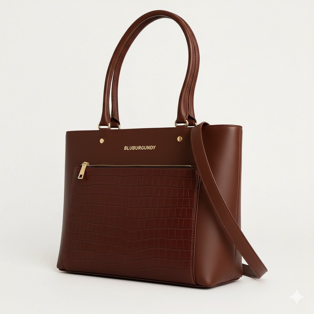 BLUBURGUNDY Premium Leather Tote Bag, Double Handle, Gold Hardware, Spacious Design